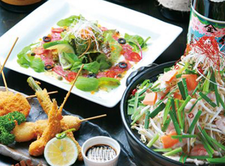 もつ鍋や串など定番の料理から、女性向けの彩り豊かな創作料理。特にパスタ系が好評!